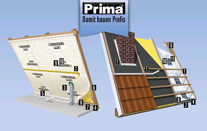 Zum Prima LKS gehören ua. die Dampfbremsfolie Prima ENERGIESPARFOL 100 (9), der Prima HOCHLEISTUNGS-DICHTKLEBER (8), die Dichtschnur Prima SPRINT (4) und die Klebebänder Prima FIX TAPE (1), Prima EASY TAPE (2) und Prima FLEX TAPE (3).