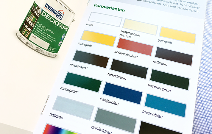 Die Remmers Deckfarbe ist eine hochdeckende und elastische Wetterschutzfarbe. Sie trocknet schnell, ist wasserbasiert, blättert nicht ab und ist dabei umweltgerecht und geruchsmild. Daher sind einige Farben sogar als RAL-Farbe normiert. So auch diverse Grüntöne, die für bergische Fachwerkhäuser verwendet werden "dürfen".