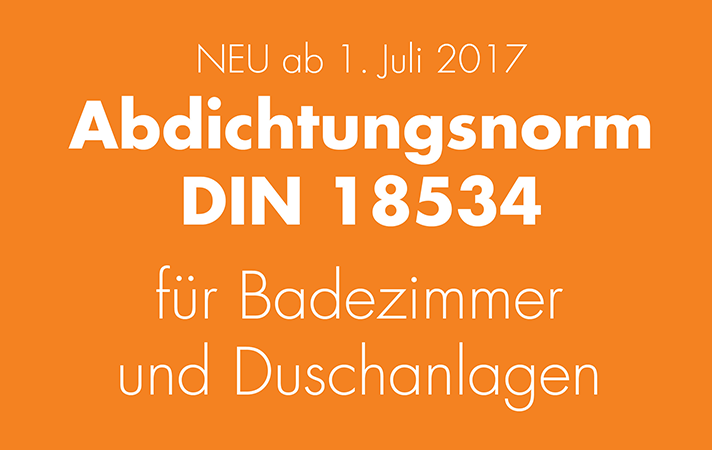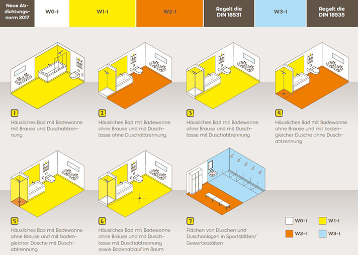 Die DIN 18534 beschäftigt sich umfänglich mit der Abdichtung von Innenräumen. In Teil 1 werden schwerpunktmäßig "durch Brauch- und Reinigungswasser beanspruchte Flächen", wie private Bad- und Sanitärräume, geregelt. Neu definiert sind darin die neuen Wassereinwirkungsklassen, die sich in vier Stufen von W0-I (gering), über mäßig, hoch und W3-I (sehr hoch) gliedern.