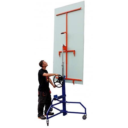 Der EDMAPLAC ist der einzige Plattenlift, der Gipskartonplatten mit geringem Kraftaufwand manuell und "automatisch" mithilfe eines Akkuschraubers anheben kann.