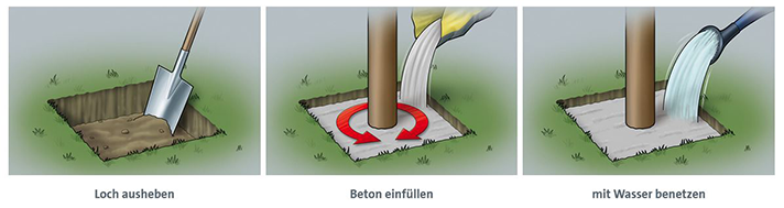 So einfach und schnell geht‘s: Einfach das Beton-Pulver direkt aus dem Sack ggf. rund um das zu montierende Einbauteil in das vorbereitete Loch geben, Wasser drauf und fertig!
