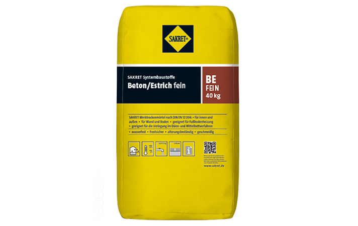 Der Beton-Estrich von SAKRET ist ein hydraulisch erhärtender, zementärer Trockenbeton mit einer 8 mm-Körnung. Er kann einfach und schnell mit einem Rührquirl in einem Mörtelkübel angemischt und sowohl mit der Hand als auch mit der Maschine (bis zu 60 Minuten) verarbeitet werden.