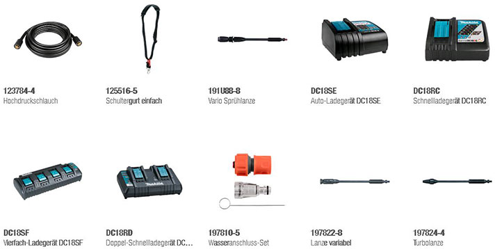Der im Lieferumfang enthaltene Wassertank dient zugleich als Aufbewahrungs- und Transportbox für den Hochdruckreiniger sowie seine Zubehöre. Makita bietet eine große Auswahl an nützlichem Zubehör. Der DHW080 ist kompatibel mit dem Zubehör der Modelle HW1200 und HW1300.