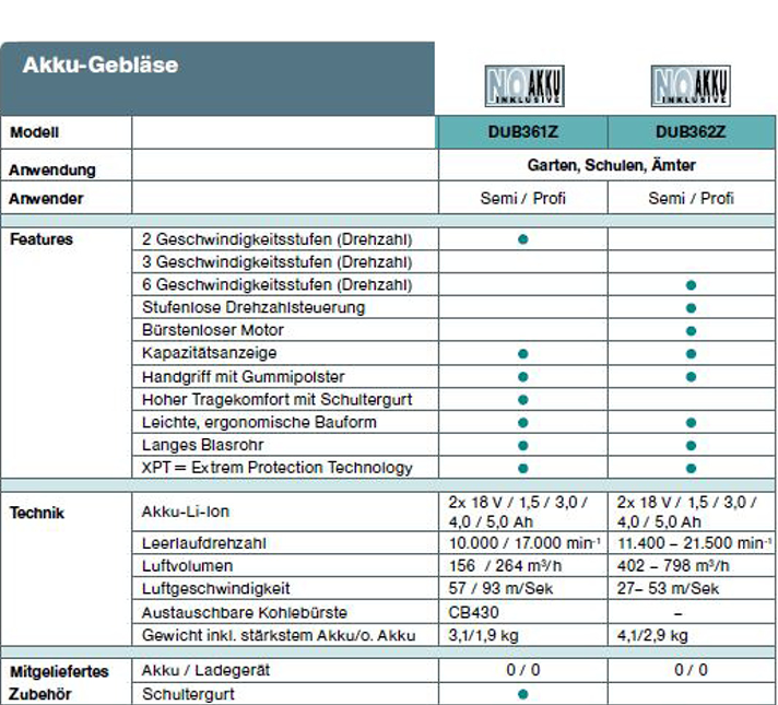 Zwei semi-/professionelle Geräte aus dem Makita-Gartenprogramm sind der DUB361Z und DUB362Z. Beide Geräte werden mit je zwei 18 Volt Makita-Systemakkus betrieben, was den Einsatz besonders praktisch und günstig macht, wenn bereits Makita-Akkus in gleicher Leistungsklasse vorhanden sind. Akkus und Ladegerät sind nicht im Lieferumfang enthalten.