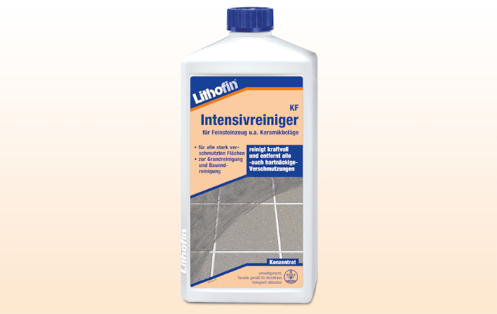 Der KF Intensivreiniger ist ein Grundreiniger für keramische Fliesen und Feinsteinzeug (KF). Das alkalische Reinigungskonzentrat dient der gelegentlichen Grundreinigung oder dem regelmäßigen Reinigen stark beanspruchter Flächen. Es beseitigt hartnäckige Verschmutzungen wie Öl- und Fettfilme, Rückstände von Pflegemitteln, Gummi- und Schuhabrieb, Polymer- und Wachsschichten sowie Selbstglanzemulsionen. Auch im Lebensmittelbetrieben und Küchen macht Lithofin KF Intensivreiniger daher einen guten Job.