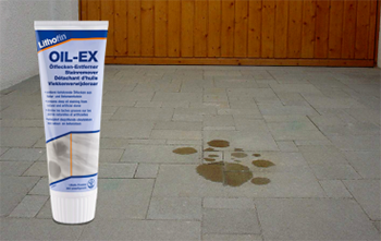 Wir haben die Lösung im Programm: Lithofin OIL-EX. Das pastöse Reinigungsmittel löst Ölflecken egal welcher Art – ob Fettspritzer und -flecken vom ausgelassenen Grillabend auf der Terrasse oder Rückbleibsel des alten Autos in der Einfahrt.