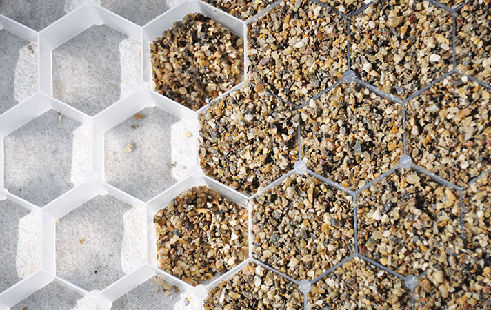 Will man Spurrillen und Senken in Kiesflächen und -wegen verhindern und diese besser begeh- und befahrbar machen oder auch verhindern, dass Gartenmöbel sich "eingraben", ist der Einsatz spezieller Stabilisierungsmatten zu empfehlen. Die wabenförmige Struktur der ACO Self® Kiesstabilisierung pro schafft einen stabilen Unterbau, hält kleine und leichte Schüttungen zusammen und verhindert das Verdrängen bzw. Verschieben der Steinchen zum Beispiel beim Rangieren mit dem PKW.