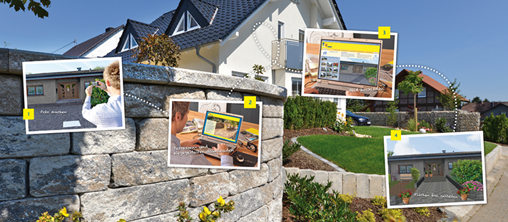 Verlegen Sie in Sekundenschnelle individuelle Pflaster und Platten aus dem KANN Sortiment und integrieren Sie Mauern, Palisaden oder Stufenanlagen. Um eine noch bessere Vorstellung von Ihrem späteren Endergebnis zu gewinnen, dekorieren Sie Ihren zukünftigen Lieblingsplatz mit Pflanzen und Gartenmöbeln. Nutzen Sie als Planungsgrundlage einfach die Kann-Bildvorlagen oder Ihr eigenes Foto der "echten" Situation.