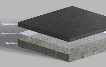 Betonplus-Platten bestehen aus einem 3 cm starken Betonkern, der durch eine Kontaktschicht dauerhaft kraftschlüssig mit einer Granitkeramik-Oberfläche in 2 cm Dicke verbunden ist. Dank des Betonkerns besitzen die Platten ein hohes Eigengewicht. Sie lassen sich daher gut im Splittbett verlegen. Angeformte Abstandhalter helfen dabei, den korrekten Fugenabstand einzuhalten. So sind die Platten einfach, schnell und kostengünstig zu verarbeiten. Die Granitkeramik-Oberfläche bietet alle Vorteile einer Keramikplatte. Sie ist leicht zu reinigen und resistent gegen Moos, Flechten sowie Grünbelag. Die hohe Kratz- und Reibfestigkeit sorgt dafür, dass die Platten dauerhaft schön bleiben. Die geringe Wasseraufnahme von 0,5 % bewirkt zudem eine hohe Frost- und Tausalzbeständigkeit.