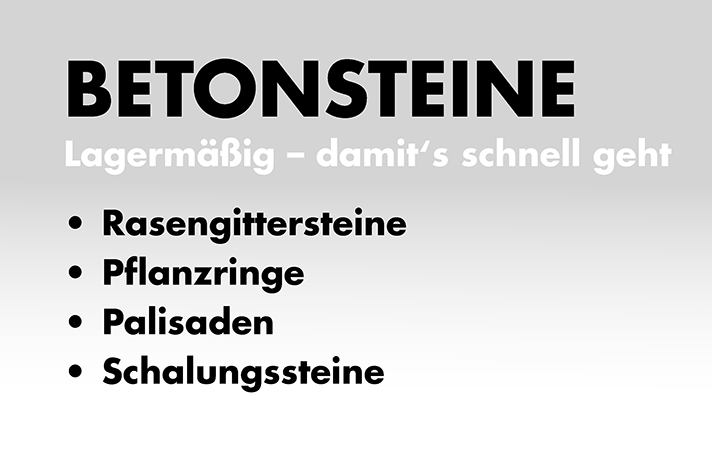 Betonsteine für Wege und Flächen sind bei uns immer lagermäßig verfügbar! Sie können die Artikel bei uns abholen oder sich termingenau liefern lassen. Unsere Mitarbeiter beraten Sie gerne!