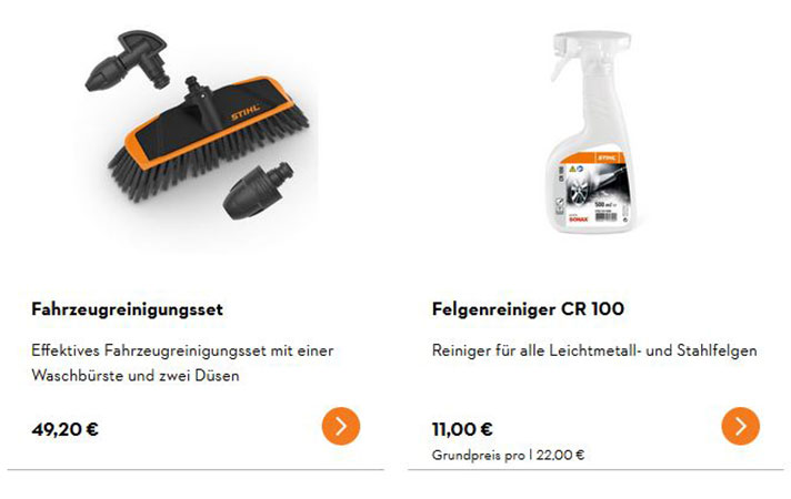 Bei besonders hartnäckigen Verschmutzungen reicht die Reinigung mit reinem Wasser und hohem Druck manchmal nicht aus. Dann wird es Zeit für den Einsatz von STIHL Reinigungs- und Pflegemitteln. Vom Universal- bis zum Spezialreiniger bietet STIHL für jede Oberflächenbeschaffenheit ein wirksames Mittel. Ideale Helfer für die Autopflege sind aber auch Zubehöre wie die Waschbürste, Aufsätze für die Schnellkupplung, Spezialdüsen etc.
