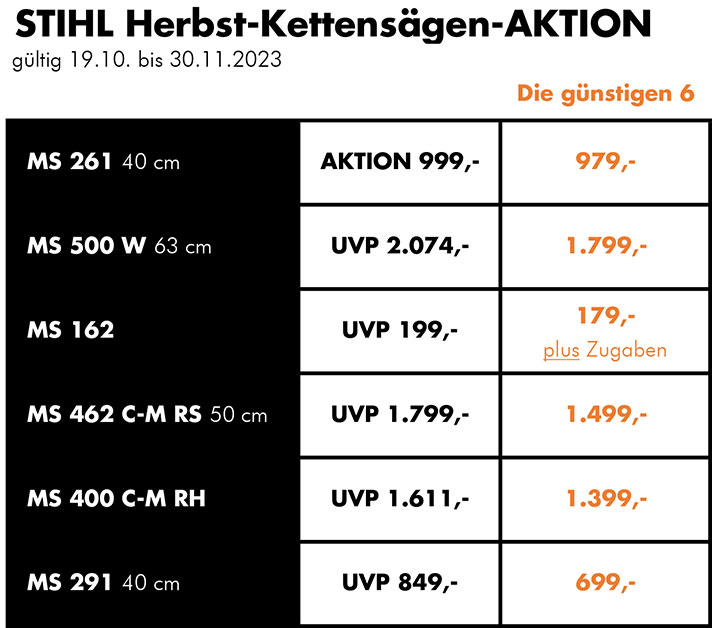 Profitieren Sie die nächsten sechs Wochen von unserer aktuellen STIHL Herbst-Kettensägen-AKTION. Wir bieten Ihnen in der Zeit sechs STIHL Kettensägen-Modelle zu besonders günstigen Aktionspreisen - sogar günstiger als aktuelle STIHL Aktionen! Solange der Vorrat reicht.