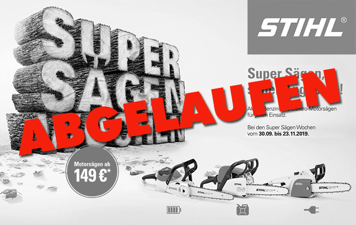 Jetzt heißt es: Bei den STIHL Super Sägen Wochen vom 30.09. bis 23.11.2019 finden Sie alles, was Sie zum Sägen brauchen. Z.B. STIHL Motorsägen ab 149 EUR.