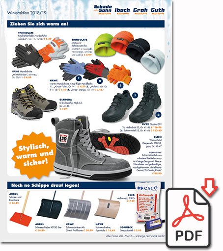 Schneeschieber, Eiskratzer, Abtausalz und Autofenster-Einteiser halten Ihnen den Weg frei, Stirnlampen und Bauleuchten erhellen Ihre Sicht und Winter-Sicherheitsschuhe, gefütterte Handschuhe und warme Mützen halten Sie auf optimaler Betriebstemperatur.Wir haben Ihnen in unserem Winterprospekt eine Auswahl hochwertiger Winterartikel der Top-Marken Adlus, Diadora, Elten, Esco, Led Lenser, Makita, Nigrin, Uvex uvm. zusammengestellt.