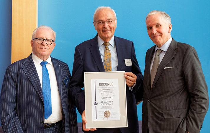 Die Abbildung zeigt den Ehrenvorsitzenden Dieter Härthe (links), Prof. Dr. Burkhard Schwenker (rechts ) sowie Jürgen Gadder (Mitte) bei der Ernennung. (Quelle: Senat der Wirtschaft, Melanie Greim)