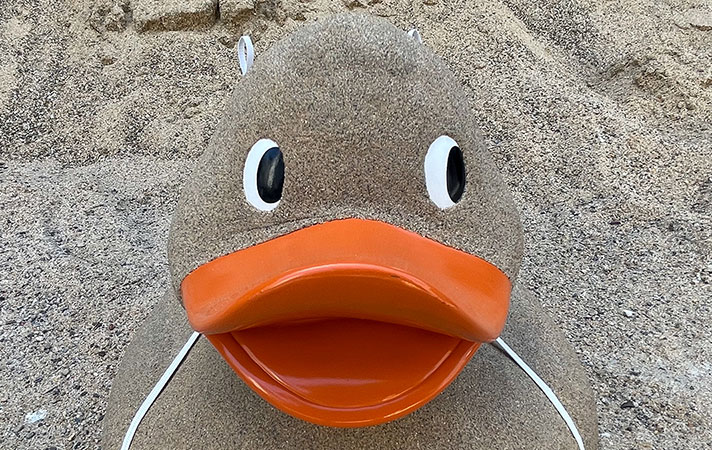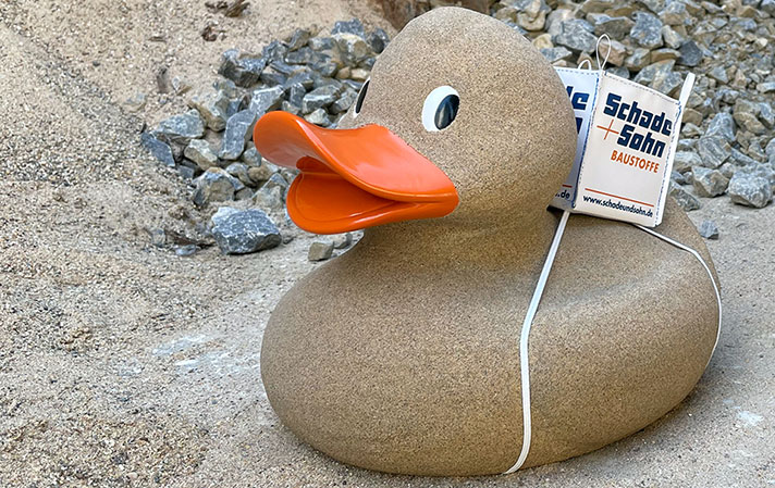"Gesattelt" mit einem Mini-BigBag springt die 2. Schade + Sohn Unternehmensente in die Fluten der Wupper. Als echte Baustoff-Ente ist sie gekleidet in feinstem Bausand. Auf ihrem Rücken trägt sie stolz eine Miniaturausgabe der Schade + Sohn BigBags, welche in normaler Größe für den Transport von einer Tonne Schüttgut wie Sand, Splitt oder Kies eingesetzt werden.