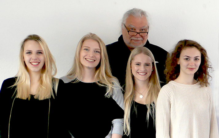 Gestaltungs-Lehrer Ralf Blaschke freut sich über die vierfache Mädelspower seiner Schülerinnen Antonia Häckel, Anja Halbach, Julia Litzcke und Diana Bagreev (v. l. n. r.).