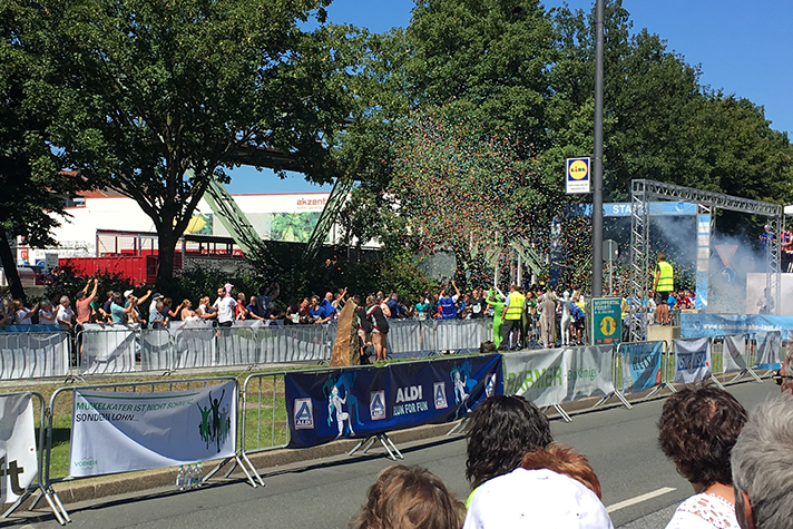 Pünktlich um 15:30 Uhr ging der diesjährige 5 km-Firmenlauf mit einem kunter-bunten Konfettiregen sowie ca. 25.000 Besuchern los. Während die letzten Läufer erst die Startlinie überquerten, lief Marcel Eckers (Team LAZ Rhede) bereits nach 16:25 Minuten ins Ziel. Gratulation!