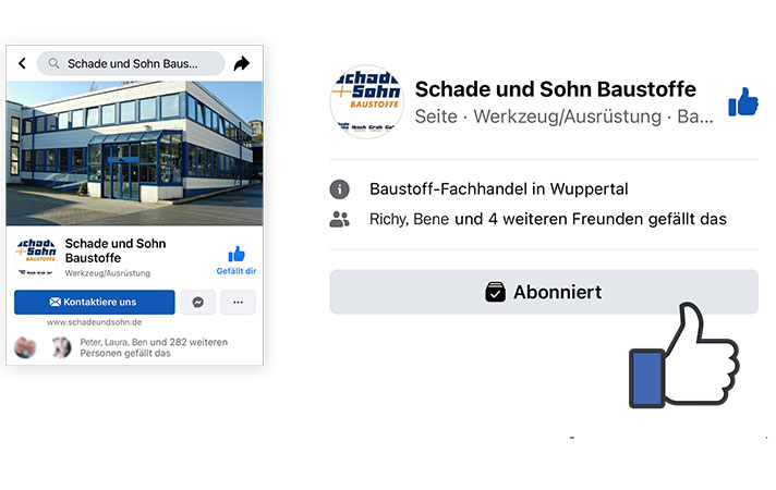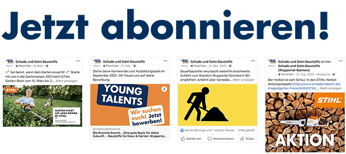 "Liken" Sie unsere Beiträge und teilen Sie diese auch in Ihrem Netzwerk. Die Seiten von Schade + Sohn sind unter den folgenden Links zu finden: