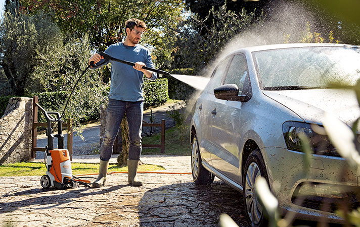 Egal ob innen oder außen - mit den richtigen Helfern bleibt der Fuhrpark immer perfekt gepflegt. STIHL Hochdruckreiniger und Zubehöre holen den Schmutz runter - sind sanft zum Lack und hart zum Schmutz. Ein besonders kompaktes Einstiegsmodell ist der STIHL HD RE 80 X (lagermäßig Stand 4-23). Dieser kann ideal mit einem GARDENA Schlauch und einer GARDENA Wand-Schlauchtrommel kombiniert werden. Das bringt viel Flexibilität und Funktion bis ans Fahrzeug.
