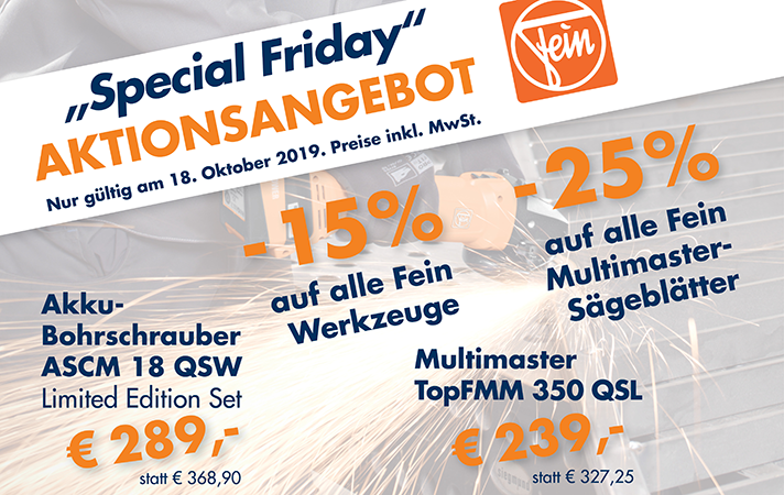 Wie von den bisherigen "Special Fridays" gewohnt, können Sie sich auch am 18.10.19 wieder durch Anwendungstechniker des Tages-Herstellers individuell beraten lassen, Maschinen selber testen und sich heiße Angebote sichern. Schauen Sie vorbei in unserem Werkzeug-Shop zum beliebten "Special Friday" – diese Woche mit FEIN.