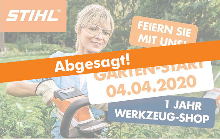 Aufgrund der aktuellen Lage müssen wir das für den 04.04.2020 geplante Event "STIHL Garten-Start 2020" sowie die Feierlichkeiten zum einjährigen Bestehen unseres Werkzeug-Shops aus Gründen der Gesundheitsvorsorge absagen.