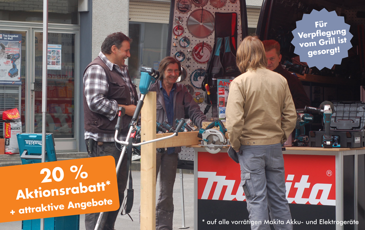 Lassen Sie sich von der Modellvielfalt, Qualität und Leistungsstärke des MAKITA-Sotiments begeistern! Wir bieten Ihnen am MAKITA-Tag neben der Möglichkeit zur Beratung durch einen MAKITA-Mitarbeiter einen attraktiven Aktionsrabatt in Höhe von 20 %* auf alle vorrätigen Makita Geräte und Zubehörteile sowie unschlagbare Aktionsangebote. (*Nicht gültig für die beworbenen Aktionsartikel.)