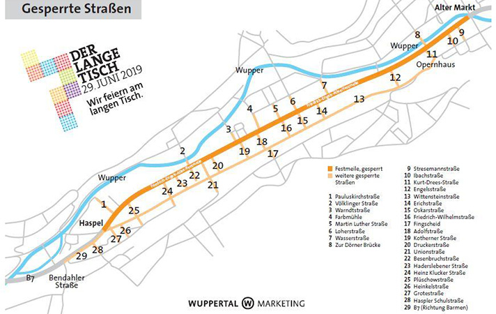 Zum diesjährigen Langen Tisch am 29. Juni 2019 gibt es eine neue Variante, und zwar eine Kombination aus Platz- und Straßenfest. Das Kerngebiet liegt zwischen Kreuzung Haspel und Opernhaus – also vor allem auf der historischen (fürs Fest gesperrten) B7 in Unterbarmen.