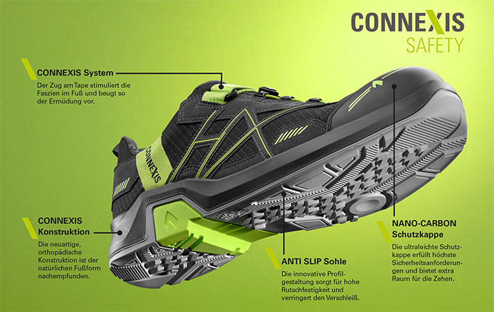 Alle CONNEXIS® Safety Modelle besitzen durch ihre speziell entwickelte, fußgerechte Leistenkonstruktion einen besonders hohen Tragekomfort. Die neuartige, orthopädische Konstruktion ist der natürlichen Fußform nachempfunden. Die innovative Profilgestaltung sorgt für festen Stand, hohe Rutschfestigkeit und verringert den Verschleiß. Die ultraleichte Schutzkappe aus Nano-Carbon erfüllt höchste Sicherheitsanforderungen und bietet extra Raum für die Zehen.