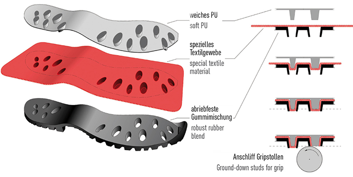 Für zuverlässige Sicherheit sorgt der metallfreie Durchtrittschutz und die Schutzkappe aus Kunststoff. Diese Metallfreie Aussattung macht den Phantom Work GTX Mid zu einem besonders leichten Sicherheitsschuh. Die innovative G³ Sohle bietet durch die angschliffenen Stollen besonders hohe Griffigkeit und optimale Performance bei Feuchtigkeit.