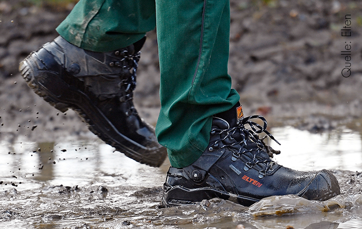 Direkt im Anschluss an die Reinigung, also im noch leicht feuchten Zustand, sollten die Schuhe mit einer auf das Material abgestimmten Imprägnierung (z.B. Spray) behandelt werden. Insbesondere bei Arbeitsschuhen aus Leder zieht dieser Feuchtigkeitsschutz so tiefer ins Material ein und verhindert/reduziert die spätere Wasser- und Schmutzaufnahme. Das ist besonders wichtig, da ein mit Wasser vollgesogenes Leder nicht mehr atmen und wärmen kann.
