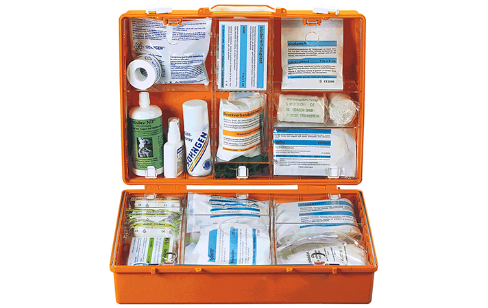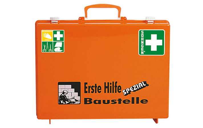 Der spezielle Erste-Hilfe-Koffer für die Baustelle ist aus schlagfestem Kunststoff – staub-, wasserdicht und robust. Er kann portabel z.B. im Fahrzeug als auch an einem fixen Standort mit Wandhalterung genutzt werden. Sobald der Koffer in der Wandhalterung geöffnet wird, wird die 90°-Stopp Arretierung aktiv. Die Arretierung sorgt dafür, dass auch im Notfall der Koffer sich leicht öffnen lässt und in der Position verbleibt.