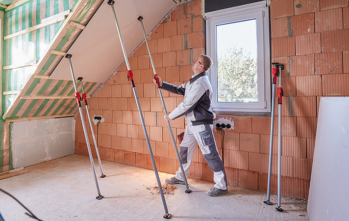Ideal für Trockenbau-Spezialisten: Die hochwertigen und äußerst stabilen Decken‑ und Montagestützen aus dem Hause BESSEY haben alles fest im Griff – ob unter der Türzarge, in über 3,5 Metern Höhe oder auch unter einer Schräge. Eine äußerst robuste Konstruktionsweise sowie stufenlos schwenkbare, rutschsichere Kontaktflächen machen es möglich.