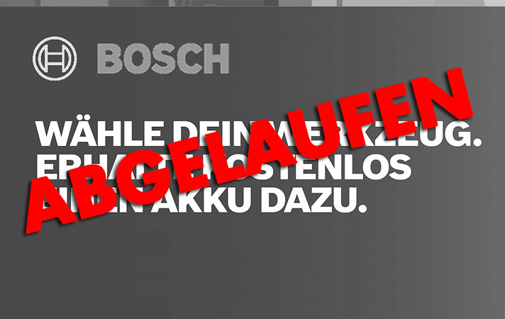 Kaufen Sie – im Aktionszeitraum vom 01.01. bis 30.04.2021 – ein BOSCH Professional 18V- oder BITURBO-Werkzeug (auch im Set) im Wert von über € 150,- (exkl. MwSt.) und registrieren dieses mit Ihrer Bosch-ID auf www.pro360.com/prodeals. Dann einfach Rechnung hochladen und Prämie-Akku zugeschickt bekommen.