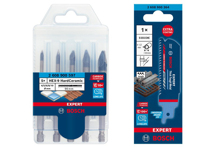 Bosch bietet in der neuen Expert-Linie über 1 000 Produkte, die Standard-Zubehören weit überlegen sind, darunter auch die neuen Fliesenbohrer „Expert HEX-9 HardCeramic“ und Säbelsägeblätter “Expert Thick Tough Metal”.