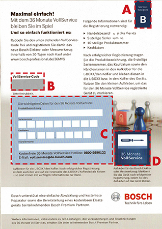 Der 36 Monate VollService gilt für alle professionellen Bosch Elektro- und Messwerkzeuge inklusive Akkus und Ladegerät. Er kann innerhalb von 30 Tagen nach dem Gerätekauf (im Zuge der Geräte-Registrierung) abgeschlossen werden.
