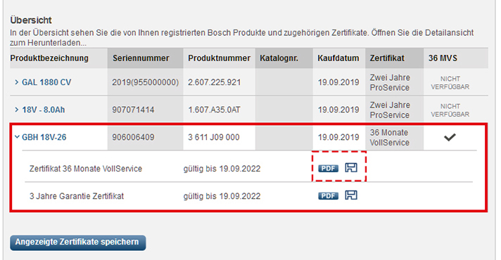 - Nach der Registrierung haben Sie sofort die Möglichkeit sich für jedes registrierte Gerät ein Zertifikat herunterzuladen und auszudrucken. Alle Zertifikate und Gerätedetails bleiben aber auch dauerhaft in Ihrem Nutzerkonto hinterlegt und können nachträglich eingesehen und ausgedruckt werden.