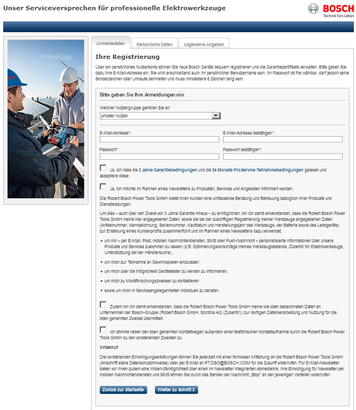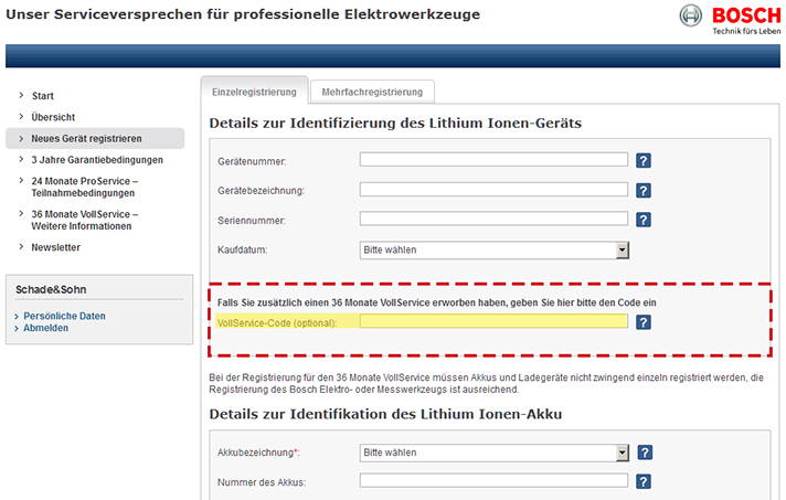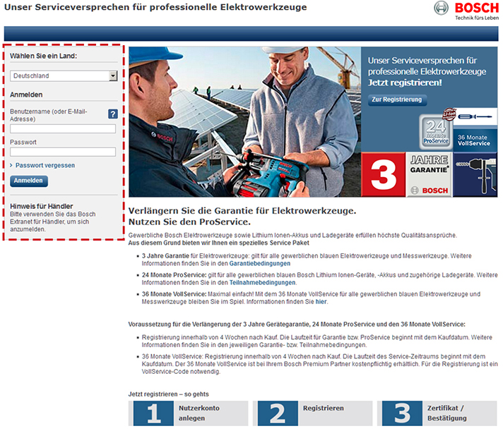 - Kunden-Registrierung auf der BOSCH Homepage (Startseite -> Service -> Garantie -> 36 Monate VollService) oder direkt zum Registrierungsbereich