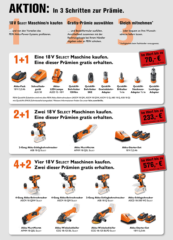 Kaufen Sie ein, zwei oder vier FEIN 18V Select Akku-Maschinen und erhalten – im Aktionszeitraum vom 01.04. bis 31.07.2019 – attraktive Prämien im Wert von bis zu 576,- € UVP des Herstellers zzgl. MwSt. gratis.