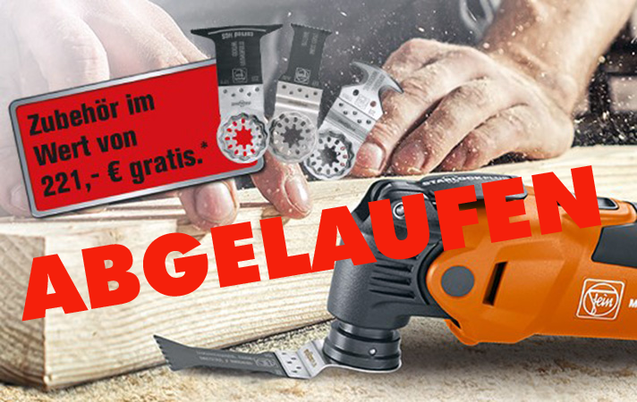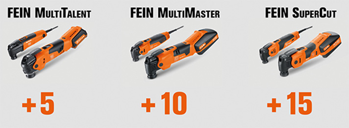 Entscheiden Sie sich für eines der FEIN Oszillierermodelle und reichen die Rechnung inklusive Ihrer Zubehörauswahl ein oder nehmen (soweit verfügbar) Ihr Wunschzubehör direkt mit. Je nach Modell-Linien gibt es bis zu 15 Zubehöre gratis...