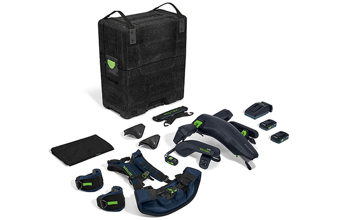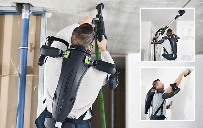 JETZT BEI UNS TESTEN: Das innovative Festool Exoskelett ExoActive entlastet beim Arbeiten vor der Brust und über Kopf mit bis zu 5 kg / 50 N Unterstützungskraft je Arm. Mit einer Extraportion an 18 V Akku-Power greift es einem sprichwörtlich unter die Arme, damit die Arbeiten an Wand oder Decke – in Brusthöhe oder über Kopf – gar nicht erst beschwerlich werden.
