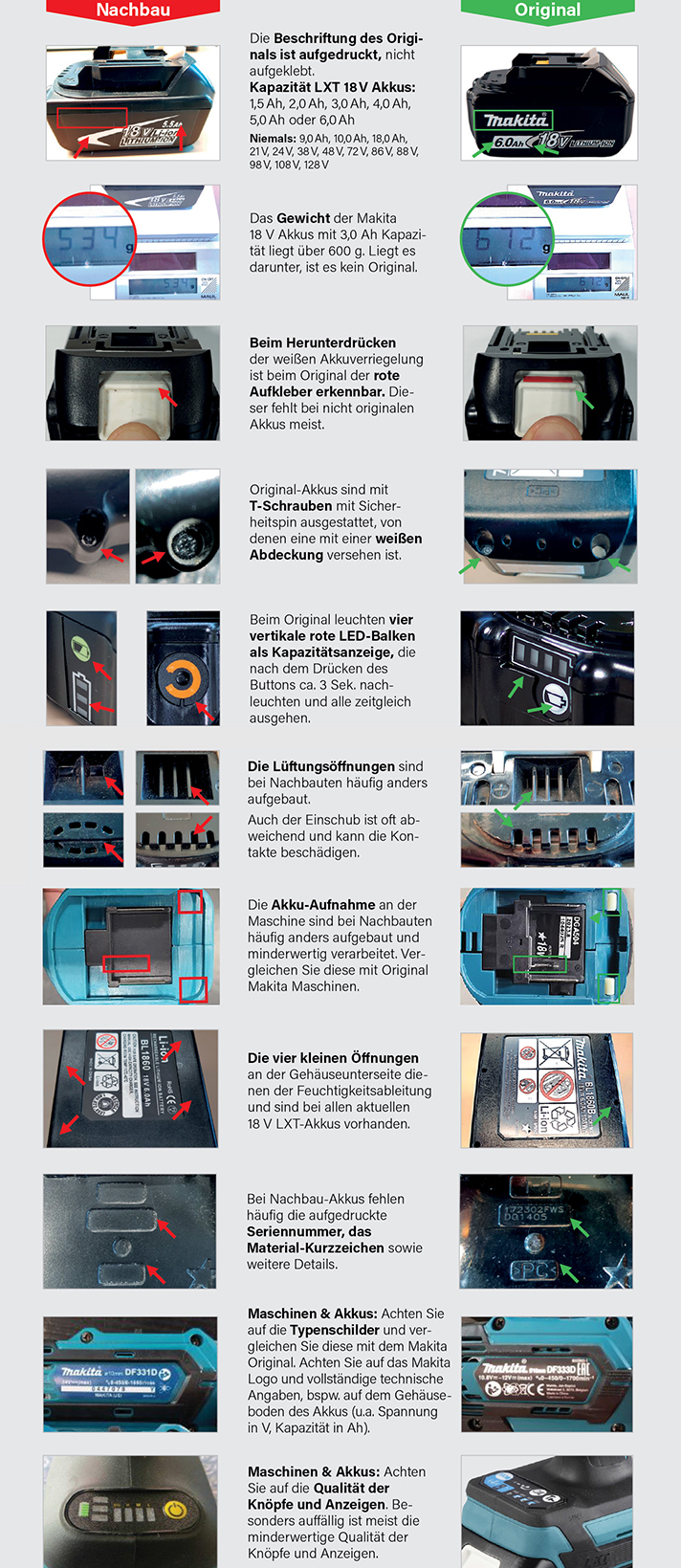 Gefälschte Akkus und Maschinen können Ihre Sicherheit gefährden! Kennen Sie die Unterschiede zwischen hochwertigen Makita Akkus und billigen Nachbauten? Schützen sich vor den Gefahren von Fälschungen. Wir helfen Ihnen, Fake von Original zu unterscheiden.