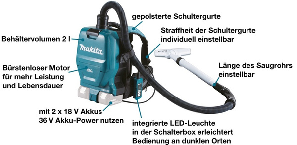 Hier noch ein paar Details zum DVC260Z Akku-Rucksackstaubsauger 2x18 V auf einen Blick: