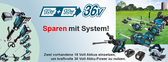 Auch für das Original-Makita-System 2 x 18 V können die Makita 18 V Akkus verwendet werden. Dieses 2 x 18 V System eignet sich speziell für Aufgaben, bei denen Kraft und Mobilität gefragt sind. So werden Anforderungen erfüllt, die bisher nur von Benzin-Geräten oder einem 36 V Akku erreicht wurden. Zwei 18 Volt Akkus werden in Reihe in das passende Gartengerät oder Werkzeug eingesetzt. Fertig. Den Rest übernimmt die Elektronik des Systems. Sie wandelt die 2 x 18 Volt in 36 Volt um.