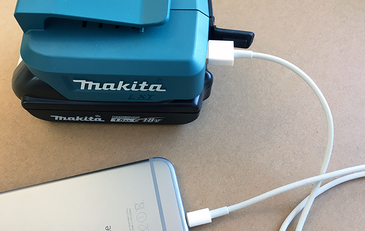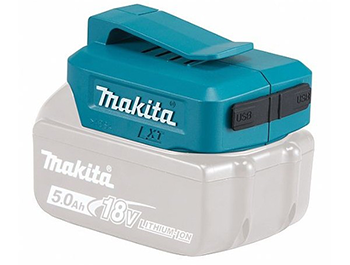 Insbesondere wenn bereits diverse Makita-Akkuwerkzeuge und entsprechende Akkus vorhanden sind! Das Makita-Zubehörprogramm bietet einen praktischen USB-Adapter für alle kraftvollen 14,4 bis 18 Volt Lithium-Ionen Systemakkus. Der robuste Akku-USB-Adapter DEBADP05 wird einfach auf den (geladenen) Akku aufgeschoben und bietet mit seinen zwei USB-Anschlüssen die Möglichkeit zwei Endgeräte zeitgleich zu laden.
