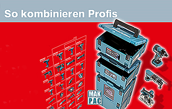 Wer zusätzliche Akkus braucht oder neu ins Makita SystemKIT einsteigt, kann zu den Geräten einfach das abgestimmte Power Source Kit bestehend aus zwei Akkus und passendem Doppelladegerät kombinieren. Alle SystemKIT-Maschinen und Akku-Kits (10,8 und 18 Volt) werden jeweils im praktischen MAKPAC geliefert.
