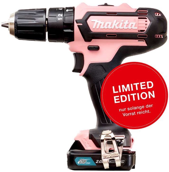 Lassen Sie sich nicht von der sanften Farbe täuschen: Der Akku-Schlagbohrschrauber HP331DSAP1 ist genau so stark und schnell wie sein blaugrüner Verwandter. Diese limitierte Sonder-Edition aus dem Hause Makita begeistert nicht nur weibliche Kollegen.